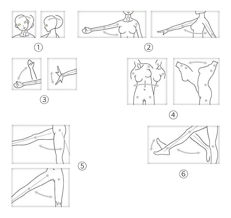 下面是我们的硅胶人偶产品各个肢体活动限制: